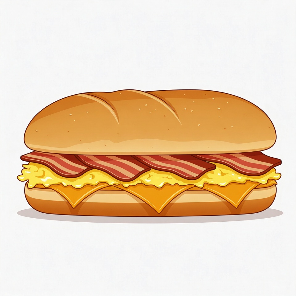 bacon, breakfast sandwich, cartoon, cheese, clipart, crispy bacon, deli sandwich, delicious, egg, fast food, food, golden bread, illustration, isolated background, lunch, meal, melted cheese, orange cheese, scrambled eggs, sub sandwich, vector art, yellow eggs, sandwich