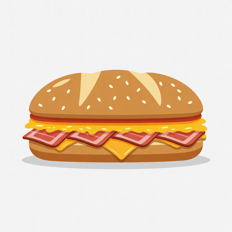bacon, bacon cheese sandwich, bun, cartoon food, cheese, clipart, fast food, food, ham slices, illustration, isolated background, lunch, meal, melted cheese, red meat, sesame seeds, sub sandwich, vector art, yellow cheese, sandwich