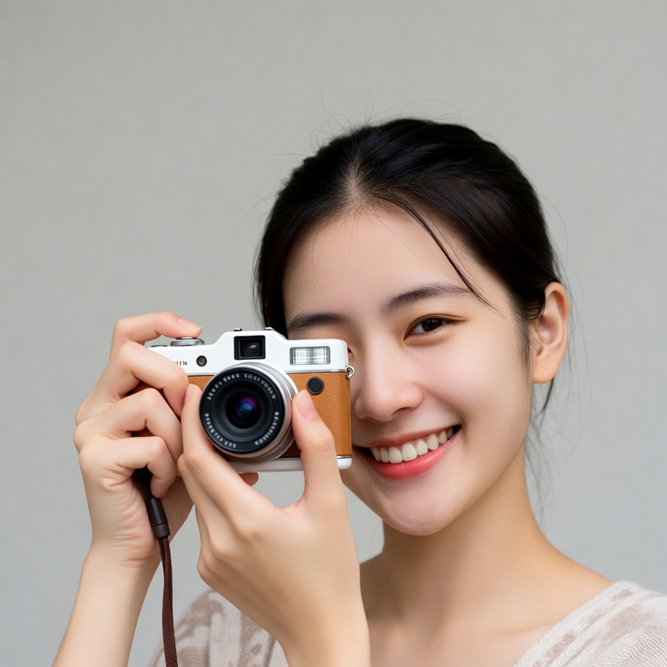 A young Asian woman with long black hair smiles while holding a white and brown vintage film camera in both hands. She looks directly at the viewer with her eyes squinted playfully through the camera viewfinder. She wears a light-colored top against a plain white background.