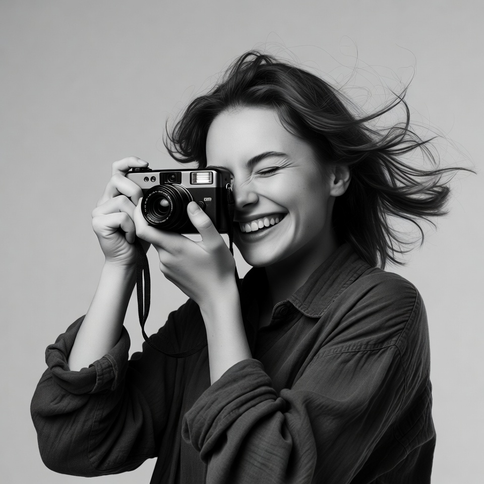 black and white, brown hair, camera close-up, female, film camera, flowing hair, happy woman, holding camera, joyful expression, laughing, loose shirt, photography, portrait, smiling, squinting eyes, vintage camera, white background, windblown hair, young woman, woman