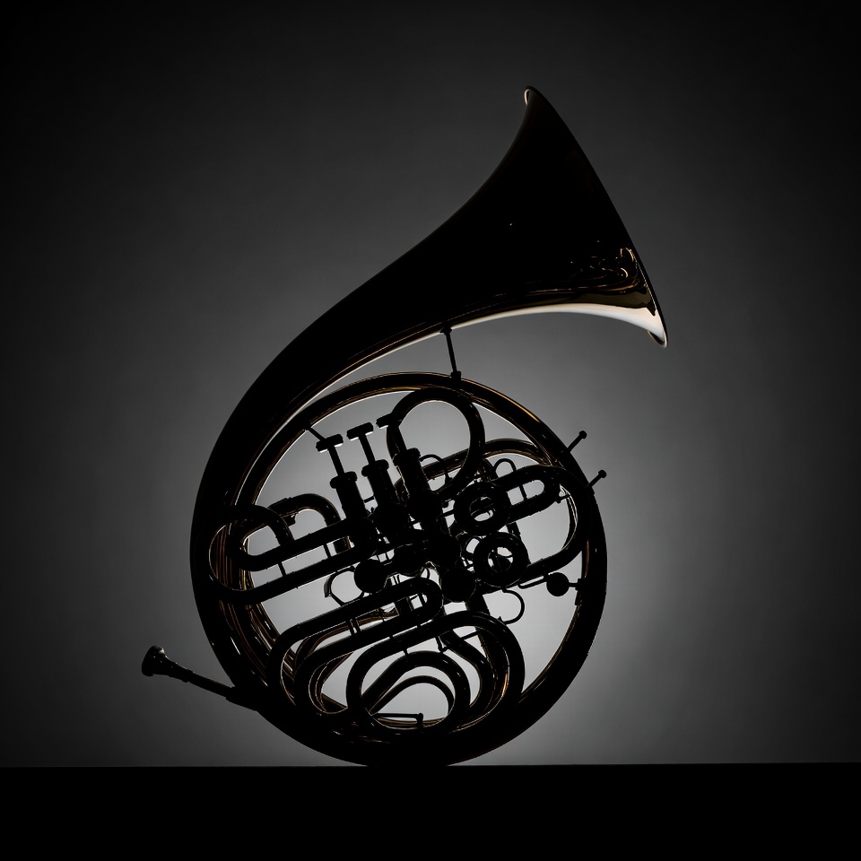 A detailed silhouette of a French horn is captured against a dark background with subtle lighting highlights. The brass instrument's curved bell and tubing are prominently featured in black shadow form. It stands isolated on a dark surface.
