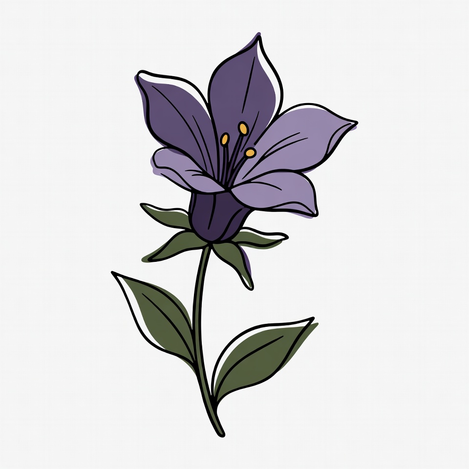blooming flower, botany, clipart, drawing, floral, flower, green leaves, illustration, isolated background, petals, stem, vector flower, white background, yellow stamens, purple flower