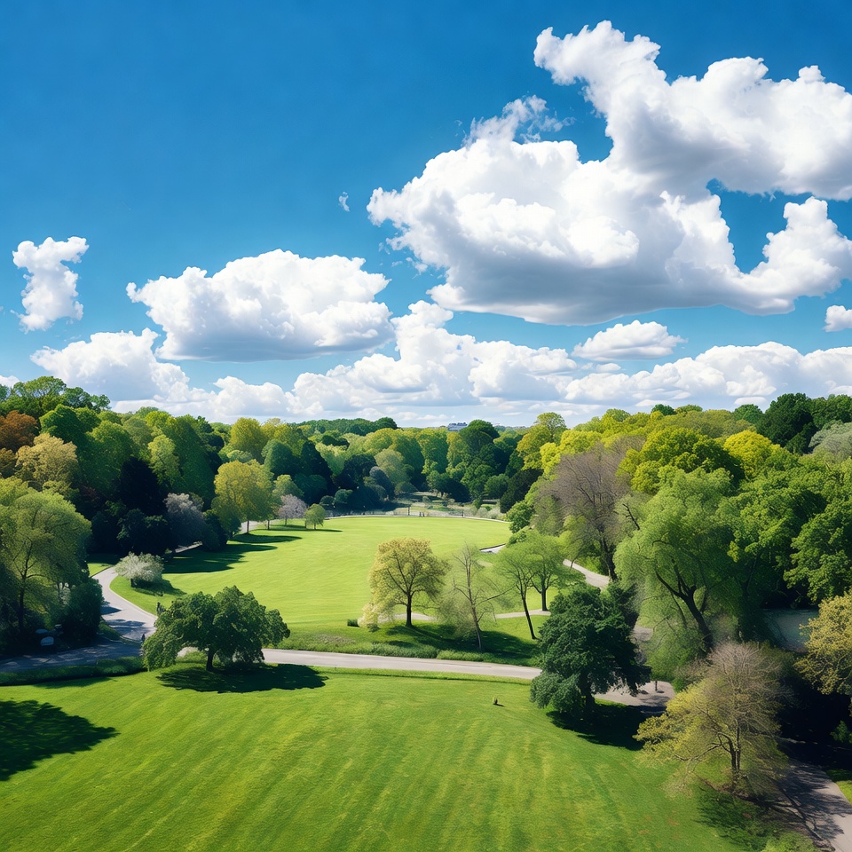A vibrant green park features winding paths, expansive lawns, and dense clusters of trees in various shades of green and yellow. Fluffy white clouds dot a bright blue sky above the scenic landscape. The image captures an overhead perspective of the serene natural setting.