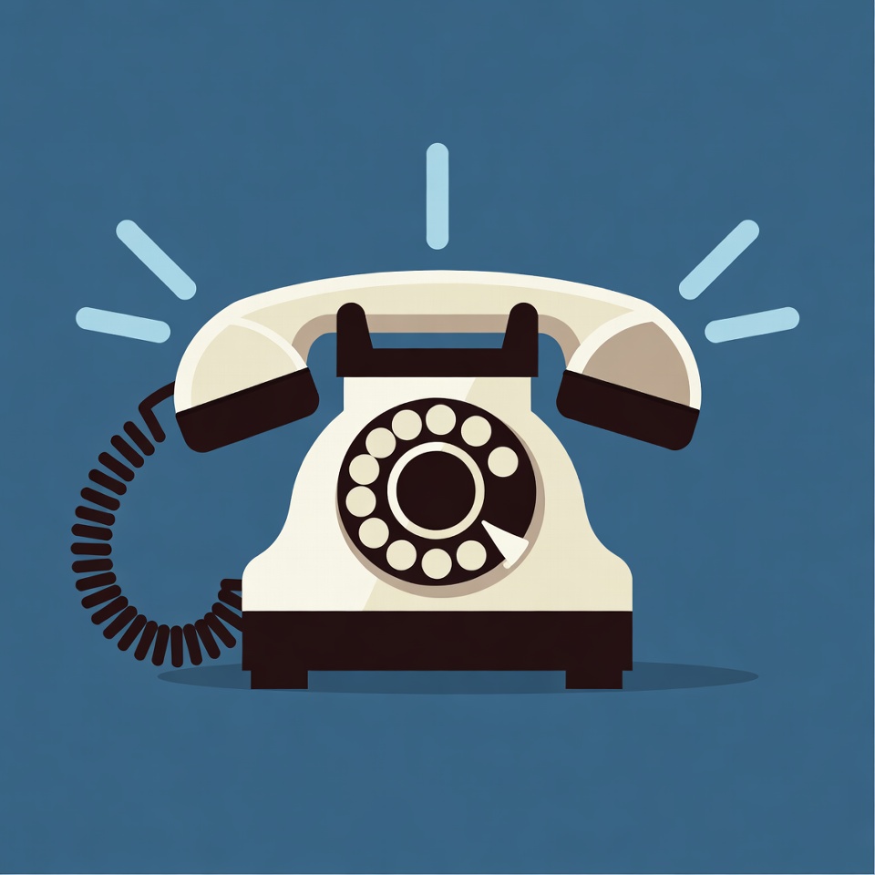 A flat illustration of a classic white rotary dial telephone with a black cord and receiver sits centered on a solid blue background. Bright white starburst rays shine around the phone, highlighting its vintage design. The phone features a prominent black dial and sturdy base.