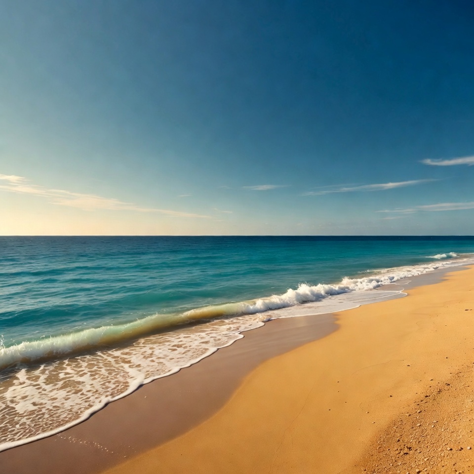 A pristine sandy beach meets the turquoise ocean under a clear blue sky. Gentle waves crash onto the golden shore, creating white foam along the water's edge. Scattered clouds dot the horizon in the distance.