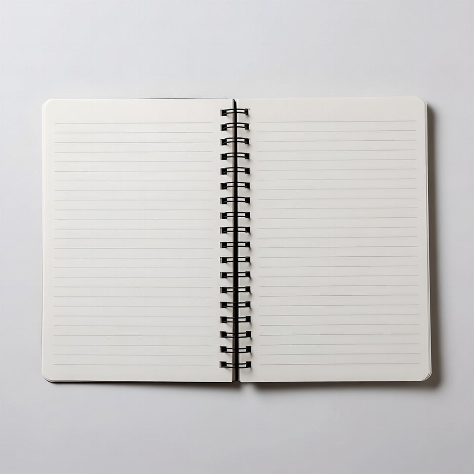 blank journal, blank pages, empty notebook, journal, lined paper, note pad, office supplies, open notebook, ruled paper, spiral binding, spiral notebook, stationery, white background, writing pad, notebook