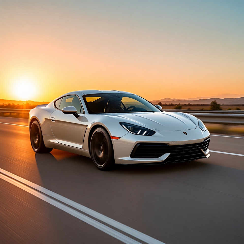A sleek silver Porsche 718 Cayman sports car drives on a highway during sunset. The car features distinctive LED headlights, aerodynamic body, and black wheels. Orange sunset skies and distant mountains frame the scene.