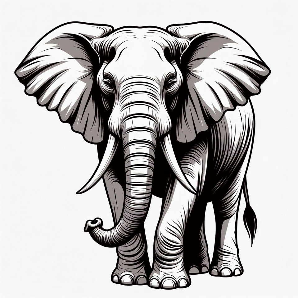 african elephant, animal, black white, detailed elephant, drawing, illustration, isolated background, large ears, line art, mammal, sketch, trunk, tusks, vector art, wildlife, elephant