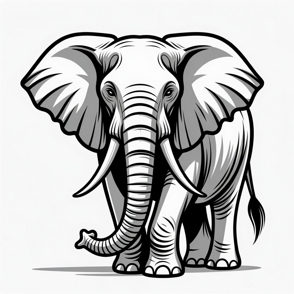 African elephant, animal, black and white, clipart, drawing, feet, graphic, illustration, isolated background, large ears, line art, outline, safari, shaded, standing, tail, trunk, tusks, vector, wildlife, elephant