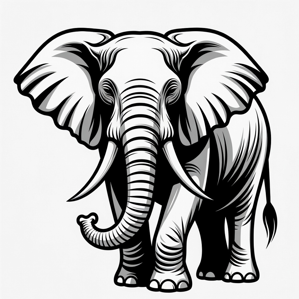A detailed black and white line art illustration of an elephant facing forward. The elephant features large flapping ears, long curved tusks, a trunk curled upward, and sturdy legs. It stands on a plain background with bold outlines and shading for depth.