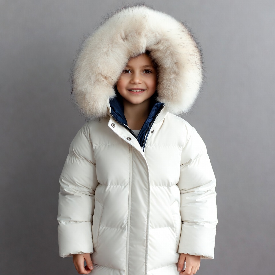 A young girl stands smiling in a white puffer jacket with a large fluffy white fur hood. The jacket features a navy blue inner lining visible around the hood and zipper. She poses frontally against a plain gray background.