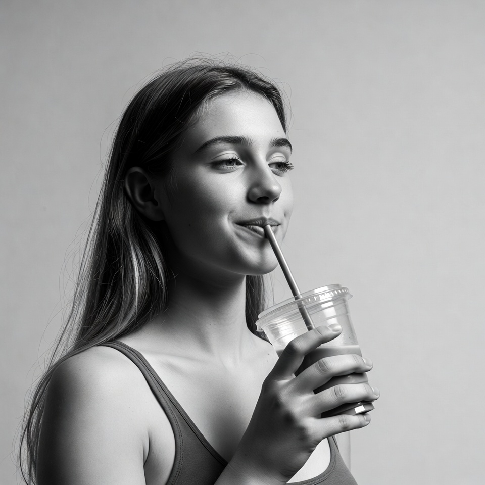A young woman with long brown hair looks thoughtfully to the side while sipping a drink through a straw. She wears a black tank top and holds a clear plastic cup with a lid. The image is in black and white with a plain background.