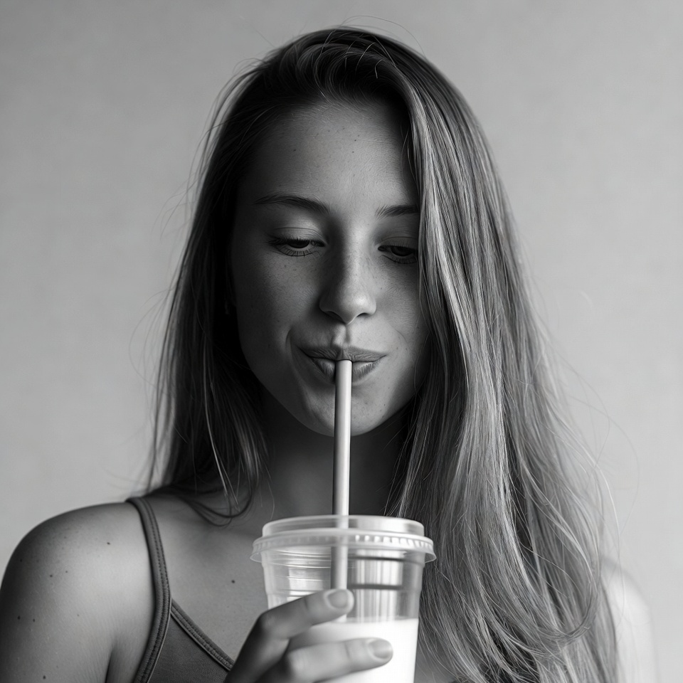 White, beverage, black and white, blonde hair, close-up, drinking milk, female, long hair, milk, plastic cup, portrait, sipping drink, straw, tank top, wavy hair, young woman, woman