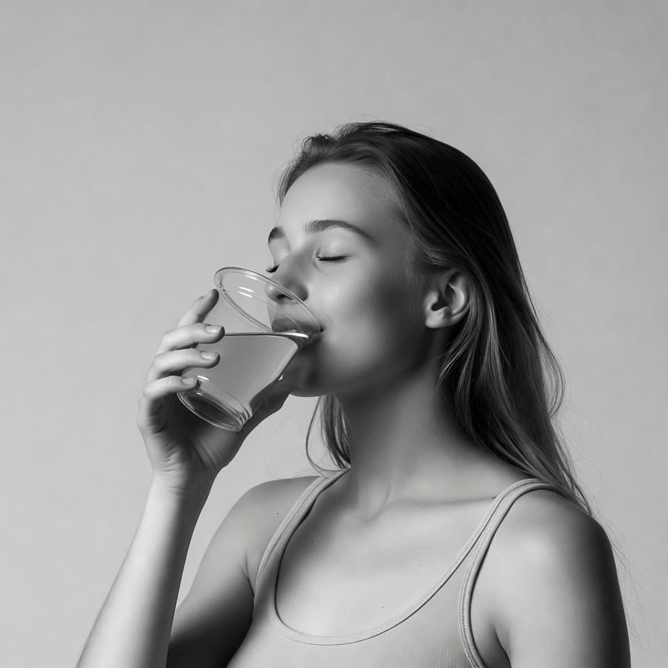 A young woman with long blonde hair drinks water from a clear glass. She wears a light-colored tank top and stands against a plain background. The image is in black and white with soft lighting.