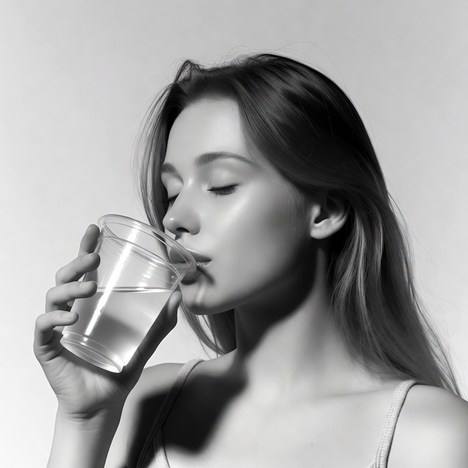 A young woman with long wavy hair drinks water from a clear plastic cup in a black and white photo. She holds the cup with both hands close to her lips, eyes gently closed. Her face is in profile against a plain light background.