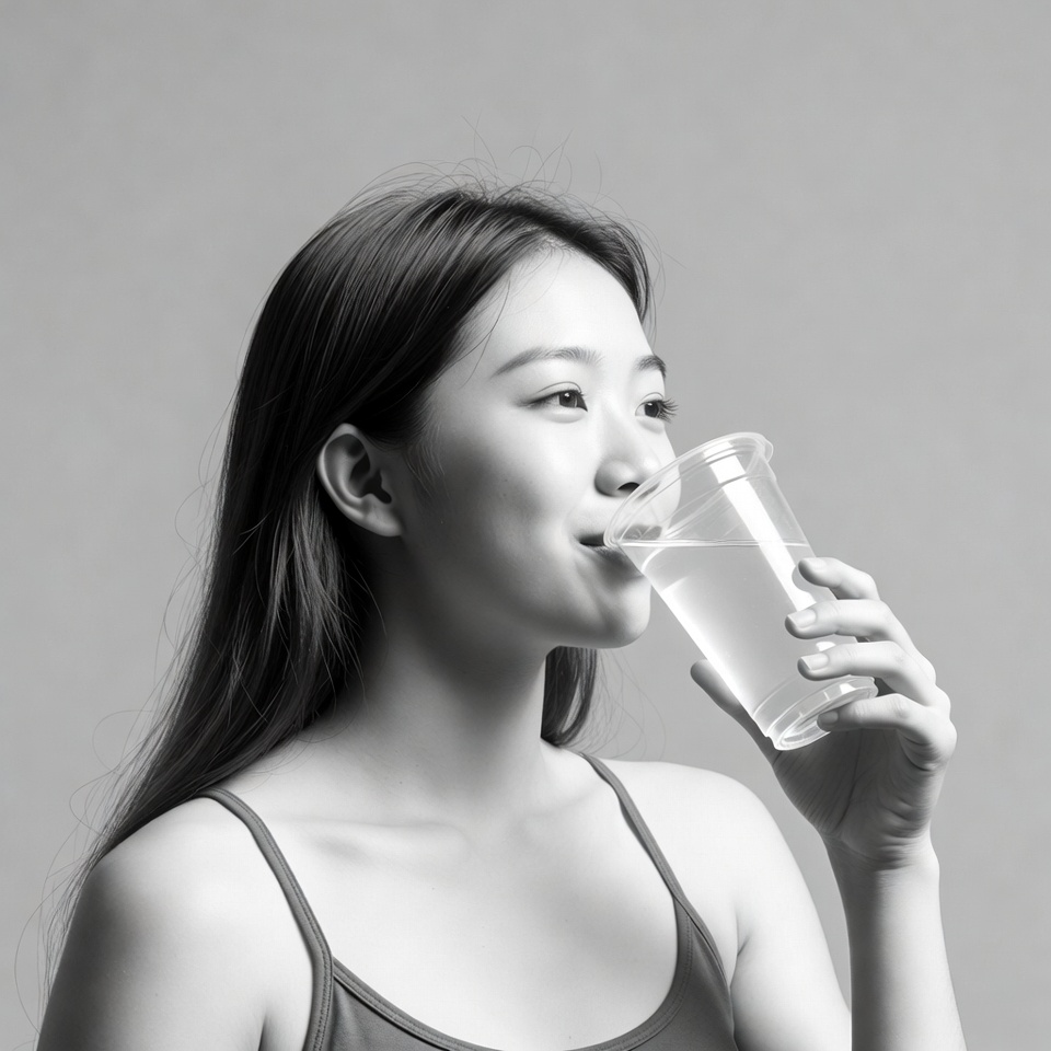 A young Asian woman with long dark hair drinks water from a clear plastic cup. She wears a sleeveless tank top and is captured in a black and white profile view against a plain gray background. Her eyes are slightly closed as she sips from the cup held in her right hand.
