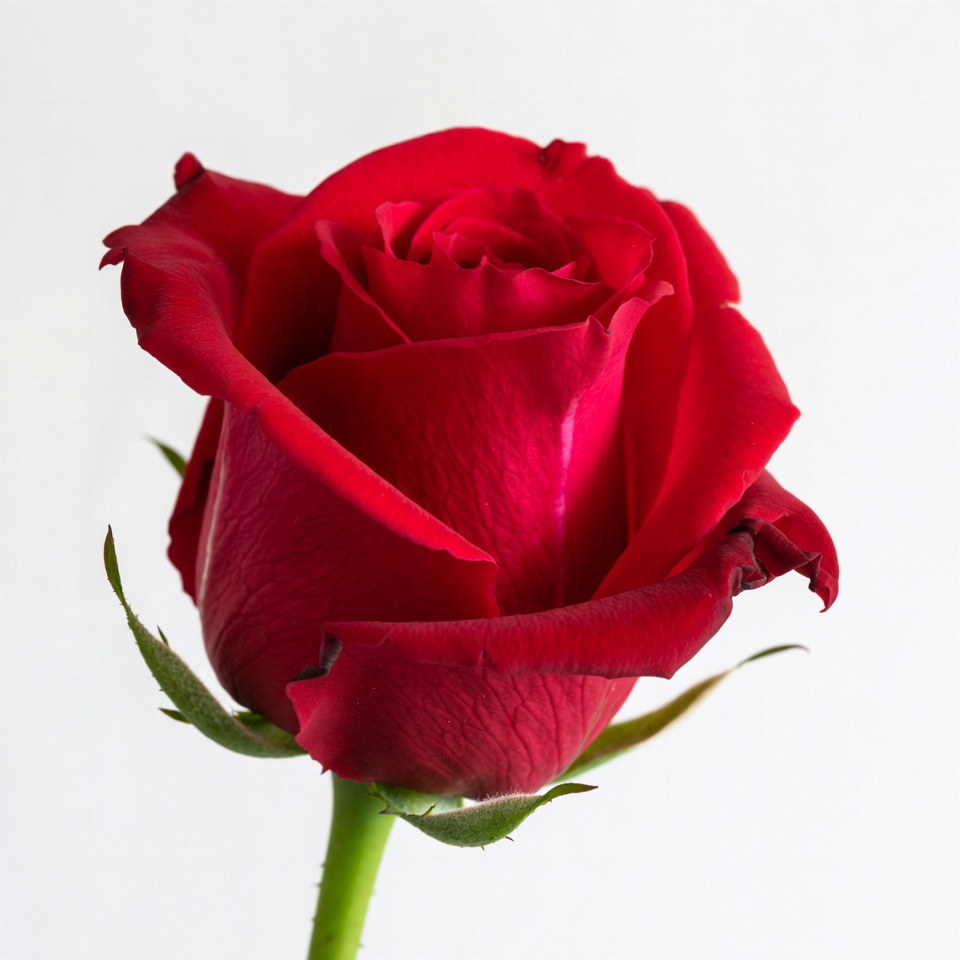 A vibrant red rose with layered petals is centered against a plain white background. The flower features a green stem and small green leaves at the base. The petals show natural texture and slight curling at the edges.