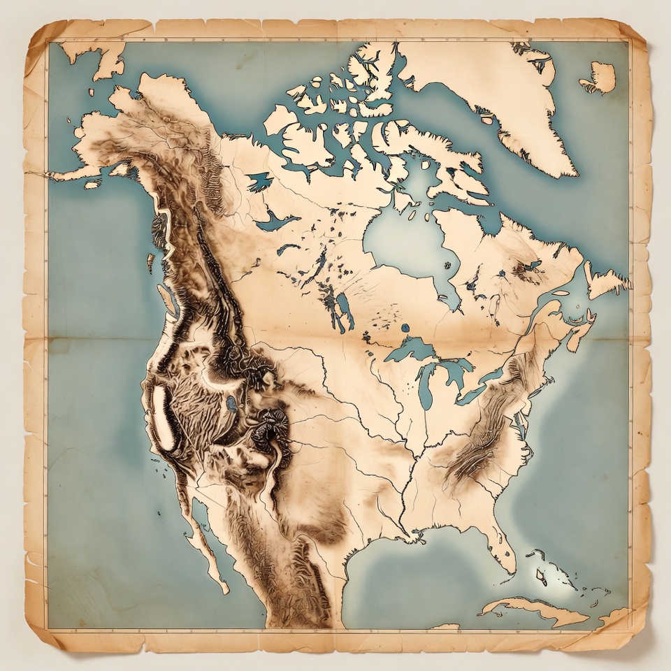 Alaska, Canada, Great Lakes, Greenland, Mexico, United States, aged paper, antique style, cartography, continent map, distressed paper, geographical map, historical map, map illustration, mountains, old map, parchment map, shaded relief, terrain, topography, vintage map, North America map