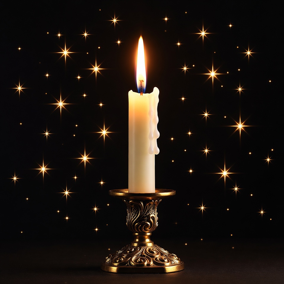 A white candle with a bright flame sits on an ornate golden holder against a black background. Melting wax drips down the side of the candle. Sparkling star-like lights surround the candle, adding a festive glow.