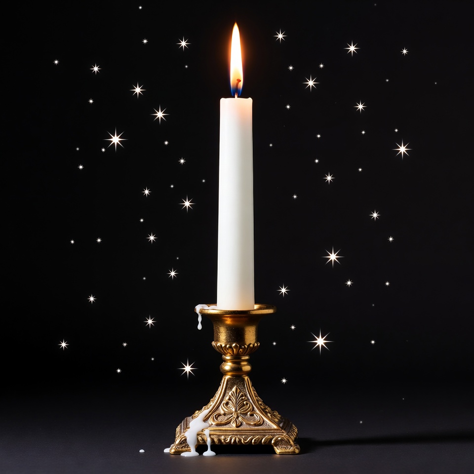 A white candle with a bright flame sits in an ornate gold candlestick on a black background. Wax drips down the candle and candlestick. Sparkling stars surround the candle, creating a festive effect.