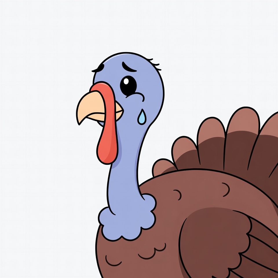 A cute cartoon turkey with a blue head and brown body faces forward on a white background. It has large expressive eyes with tears streaming down and a red wattle. The illustration features fluffy feathers and an isolated design.