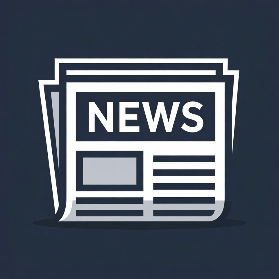 A flat illustration of stacked newspapers on a dark background. The top newspaper prominently displays 'NEWS' in bold white letters with a gray placeholder image below. The design features clean white outlines and subtle shadows for a modern icon appearance.
