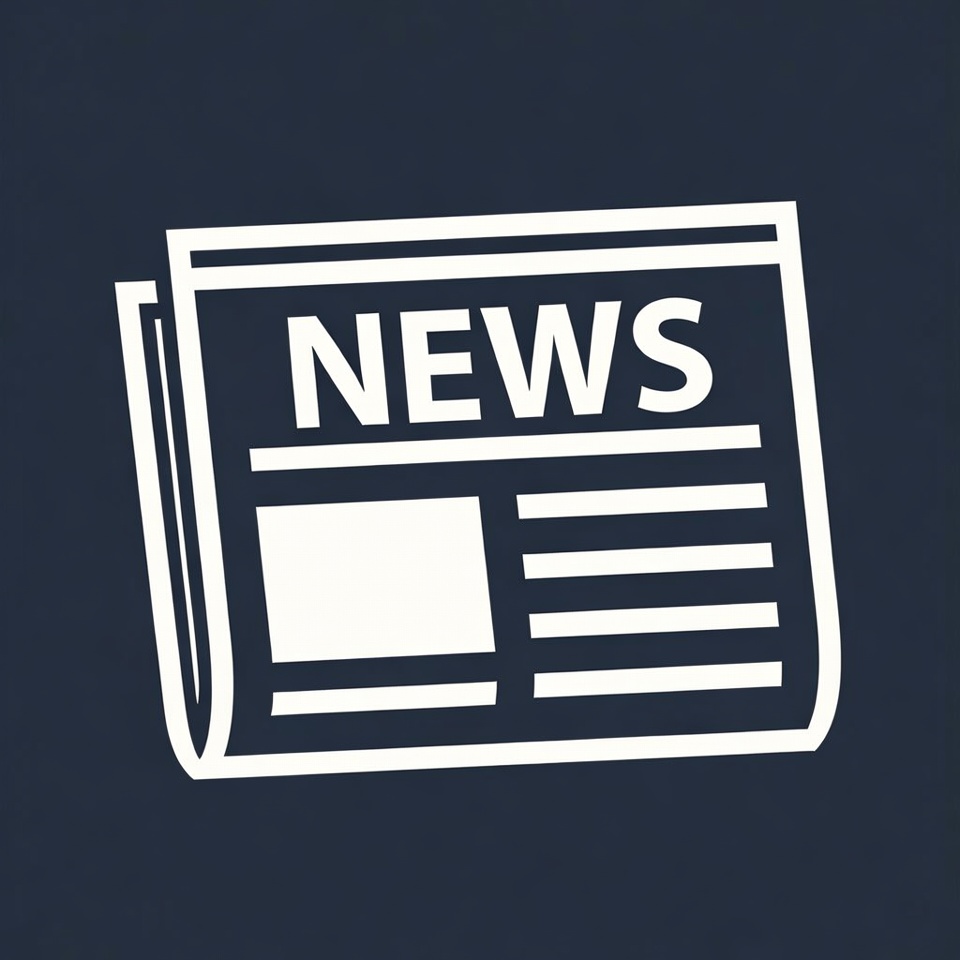 A simple line art illustration of a folded newspaper with the word 'NEWS' prominently displayed on the front. It features a blank space for an article image and horizontal lines suggesting text columns. The icon is white on a dark navy background.
