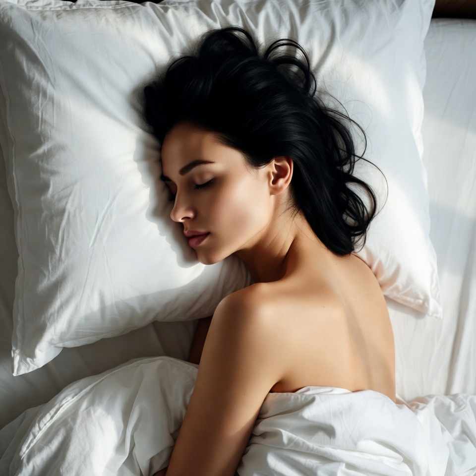 A young woman with long black hair lies sleeping peacefully on white pillows and sheets in bed. Her eyes are closed, and her bare back and shoulders are visible as she rests her head on the pillow. Soft natural light illuminates the serene bedroom scene.