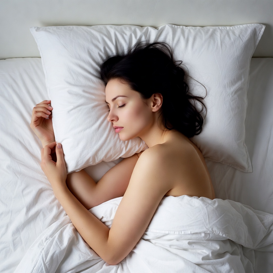 A young woman with long dark hair sleeps peacefully on white sheets in a bed. Her eyes are closed, and she embraces a white pillow with her hands while lying nude under the covers. Her shoulders and upper chest are exposed above the sheet.