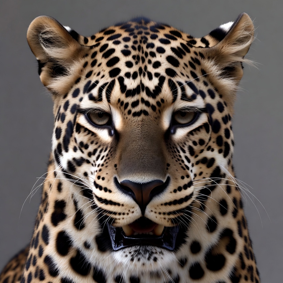 animal face, big cat, close-up, ears, eyes, fierce, fur, gray background, headshot, intense gaze, isolated, mammal, portrait, powerful jaws, predator, rosettes, snarling, spots, teeth, whiskers, wild animal, wildlife, leopard