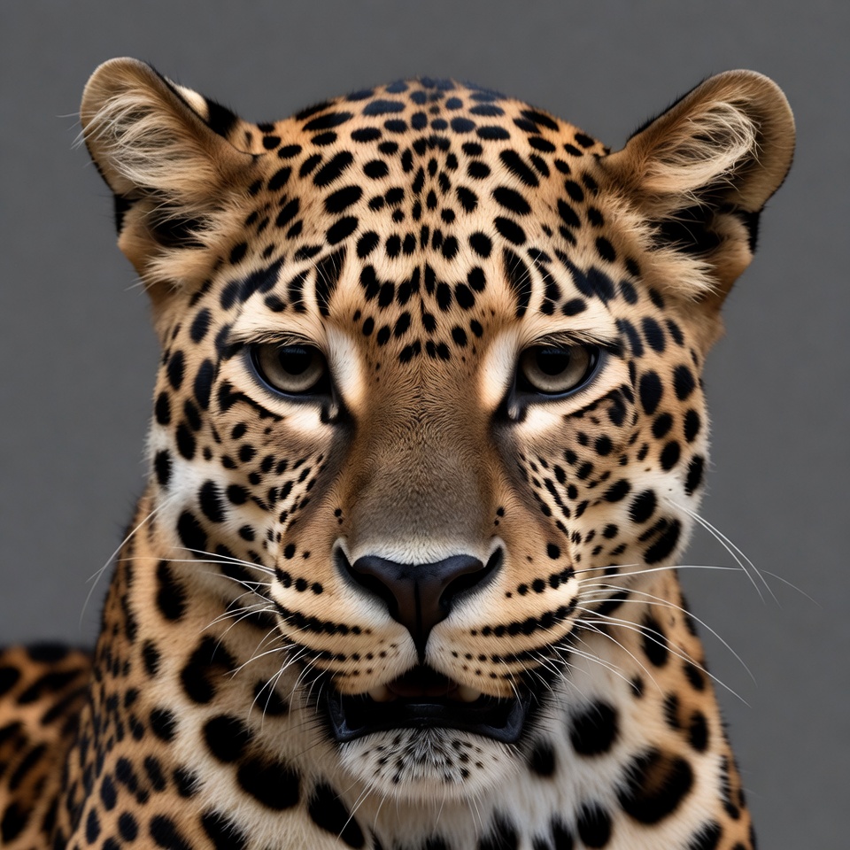 animal portrait, big cat, close-up, ears, eyes, face, feline, fur, gray background, headshot, isolated background, mammal, predator, rosettes, spots, whiskers, wild animal, wildlife, leopard