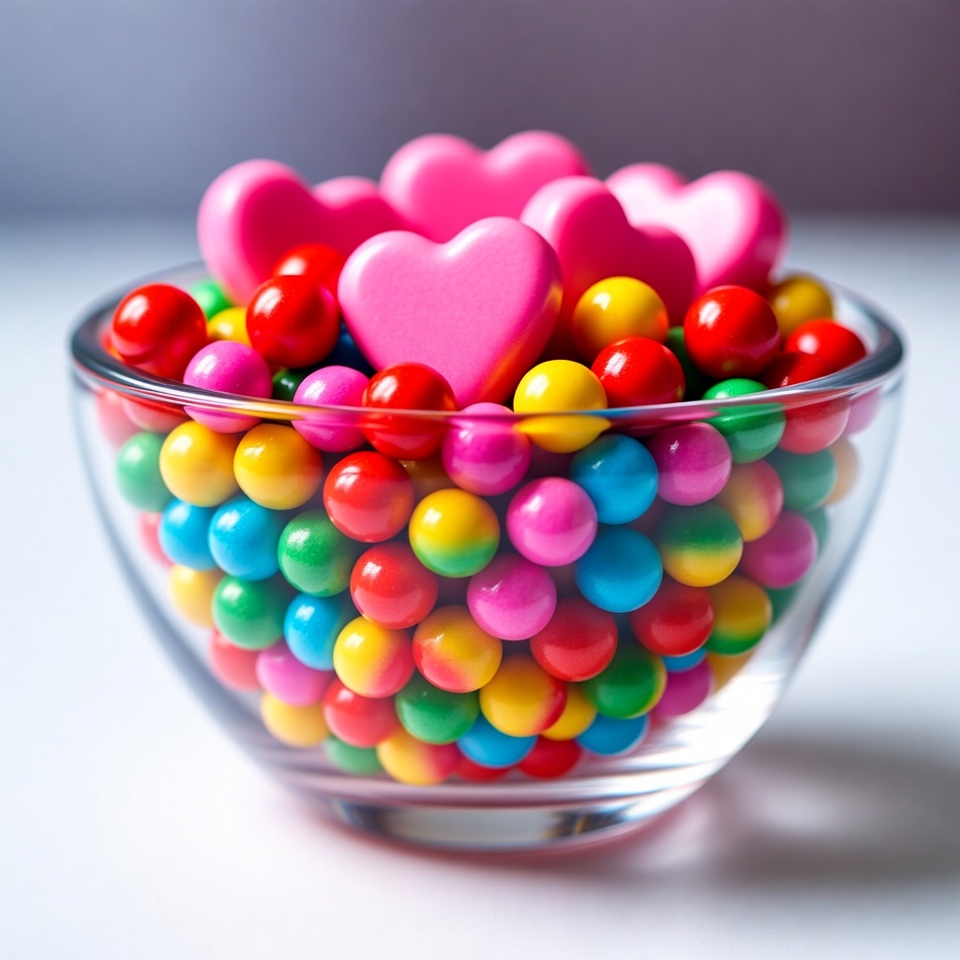 A clear glass bowl overflows with vibrant multicolored candy hearts and round candies in shades of red, pink, yellow, green, blue, and purple. Pink heart-shaped candies cluster prominently at the top. The bowl sits on a white surface against a soft gray background.