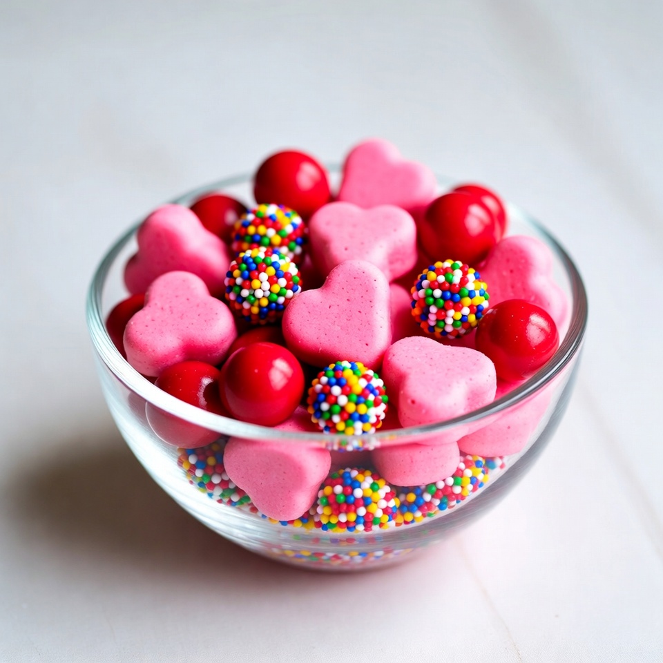 A clear glass bowl filled with colorful heart-shaped candies sits on a white surface. The candies include pink, red, and multicolored sprinkle-covered hearts, along with round red and rainbow gumballs. The vibrant assortment features glossy textures and a clustered arrangement.