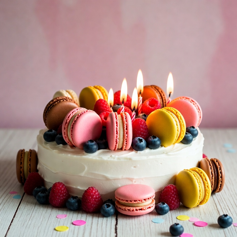 A white round cake is topped with colorful macarons in pink, yellow, brown, and orange shades, along with fresh blueberries and raspberries. Four lit birthday candles are inserted among the macarons. The cake sits on a wooden surface with scattered confetti against a soft pink background.
