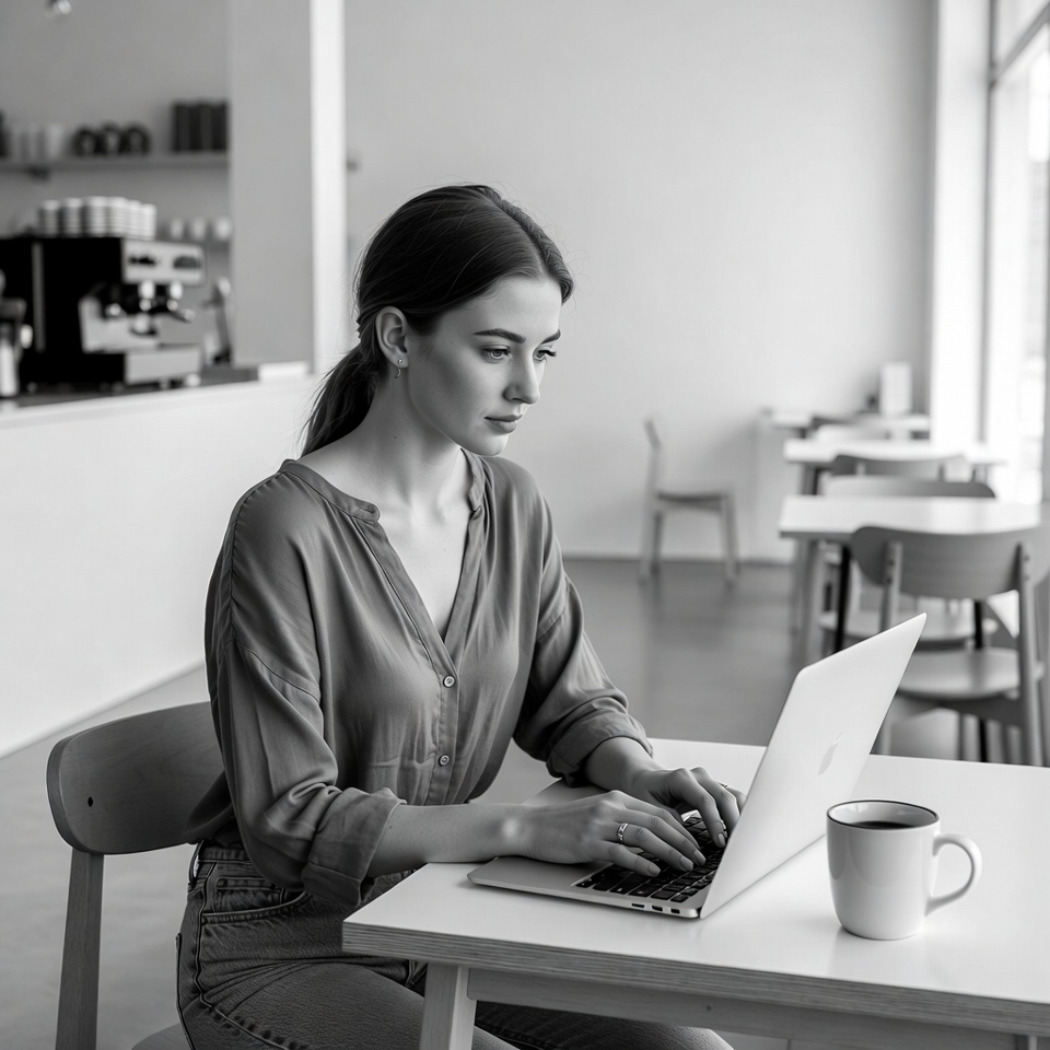 A young woman with long brown hair tied in a ponytail sits at a white table in a modern cafe, typing on a silver laptop. She wears a loose green blouse and jeans, with a white coffee mug nearby. The black-and-white image shows empty chairs and tables in the background, along with cafe counters and shelves.