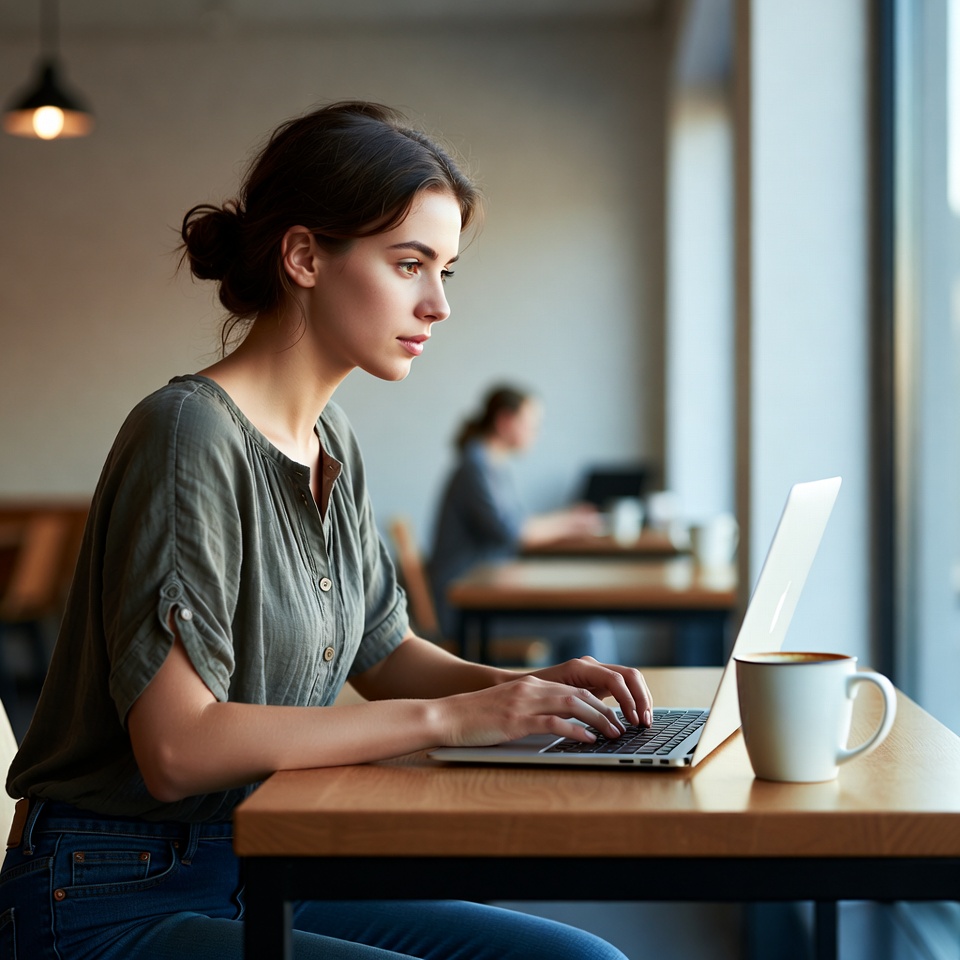 A young woman with brown hair in a bun sits at a wooden table in a modern cafe, typing on her open laptop. She wears a green blouse and jeans, with a white coffee mug beside her. Large windows and blurred background tables with other patrons are visible.