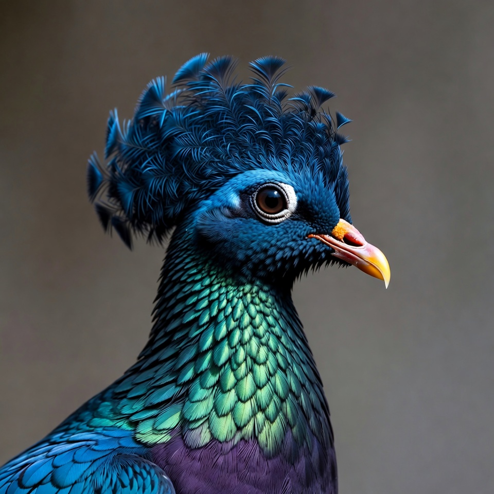 animal portrait, avian, bird, blue crest, blue pheasant, closeup, crested pheasant, exotic bird, feathers, green feathers, iridescent feathers, isolated background, orange beak, purple feathers, wildlife, pheasant