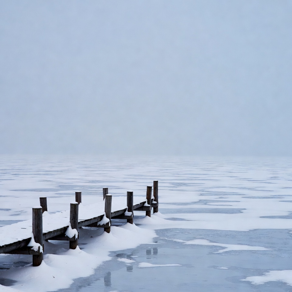 blue tones, cold weather, dock, frozen lake, frozen water, horizontal, ice, icy surface, lake pier, landscape, misty, nature, outdoors, overcast sky, posts, serene, snow, white snow, winter, wooden pier