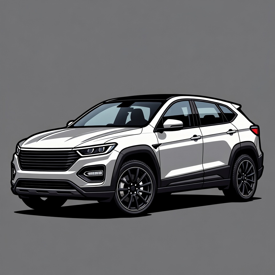A modern white SUV with black roof and accents is illustrated in a vector style. It features sleek headlights, large black wheels, and a sporty design with prominent fenders. The vehicle is positioned at an angle against a solid gray background.