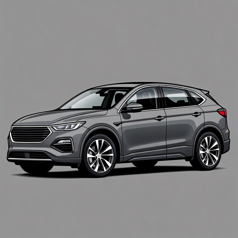 A detailed vector illustration of a sleek gray SUV with a modern front grille, LED headlights, and alloy wheels. The car features a crossover design with tinted windows and sporty accents. It is centered on a transparent gray background.