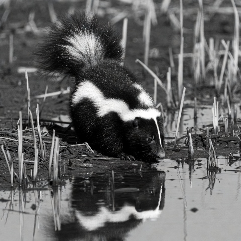 animal, black and white, drinking water, furry, grass, marsh, monochrome, nature, outdoor, puddle, reeds, reflection, striped skunk, stripes, tail, wetland, wild animal, wildlife, skunk