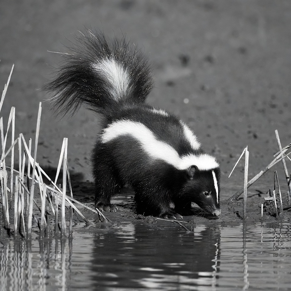 animal, black and white, drinking water, fur, isolated background, mammal, monochrome, mud, nature, puddle, reeds, striped skunk, tail, wildlife, skunk