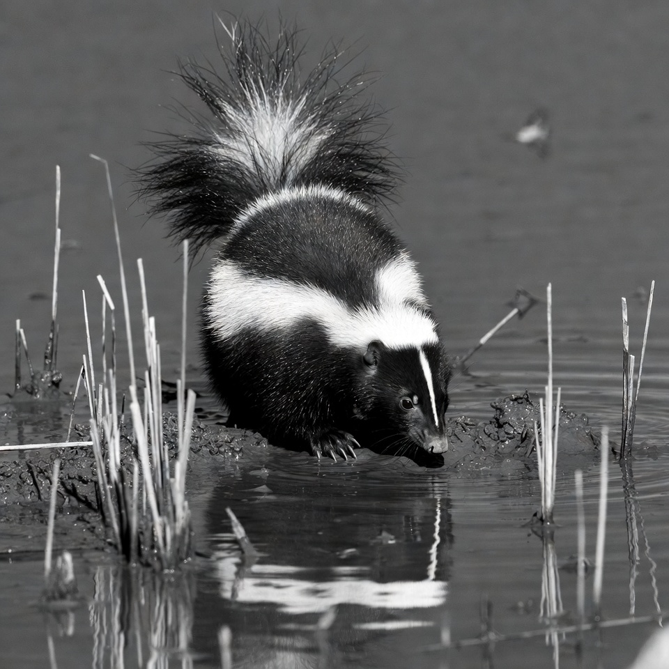 animal, black and white, bushy tail, drinking water, isolated background, mammal, monochrome, mud, nature, paws, reeds, reflection, shallow water, striped skunk, wildlife, skunk