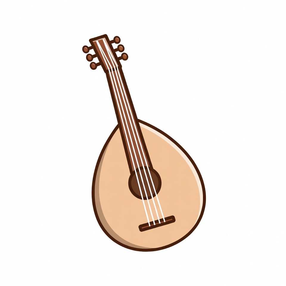 Arabic instrument, brown neck, cartoon, clipart, illustration, isolated background, lute, musical instrument, pear shaped, string instrument, strings, tan body, traditional music, tuning pegs, oud