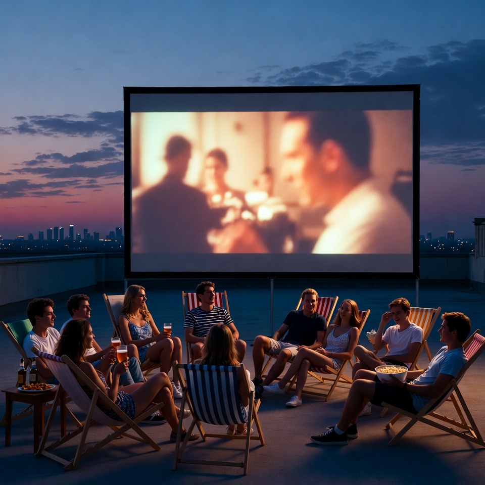 Adirondack chairs, Multiracial, White, beverages, casual seating, chairs, city skyline, drinks, dusk, evening event, film projection, friends gathering, group watching, large screen, men, movie night, night sky, outdoor cinema, popcorn, snacks, social gathering, twilight, urban rooftop, women, young adults, rooftop movie