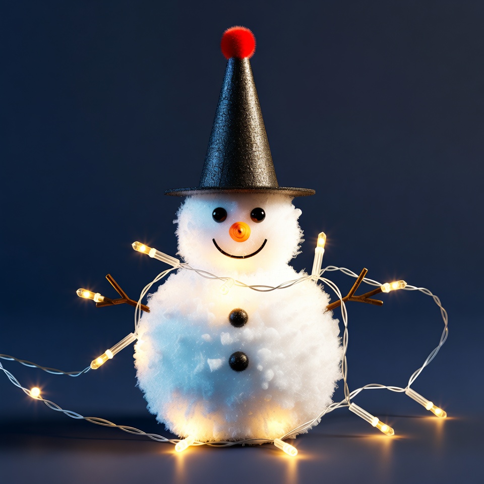 A cute snowman with a black pointed Santa hat topped by a red pom-pom stands on a dark blue background. It has a smiling face with black eyes and buttons, carrot nose, and twig arms wrapped in glowing string lights. The fluffy white snowman body is illuminated by the warm yellow lights.