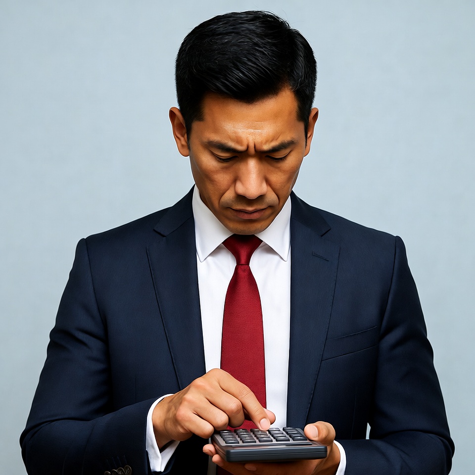 A middle-aged Asian man in a dark blue suit and red tie stands against a light blue background, intently using a handheld calculator. He has short black hair and a focused expression with furrowed brows. His hands are positioned over the calculator buttons as he performs calculations.