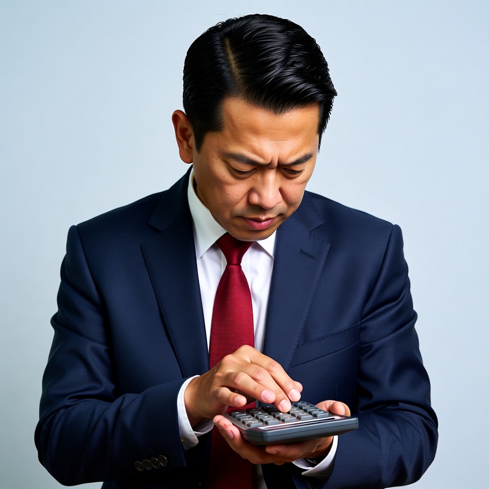 A middle-aged Asian man in a navy blue suit and red tie stands against a white background, intently using a handheld calculator. He has neatly combed black hair and a focused expression with furrowed brows. His hands grip the gray calculator firmly as he presses the buttons.