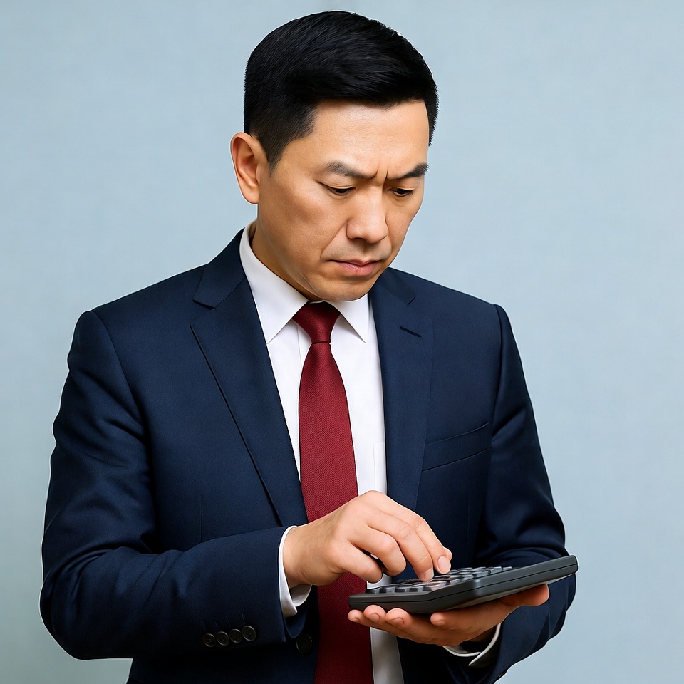A middle-aged Asian man in a navy blue suit and red tie stands against a light blue background, intently using a black handheld calculator. He has short black hair and a focused expression with furrowed brows. His hands grip the calculator firmly as he presses the buttons.