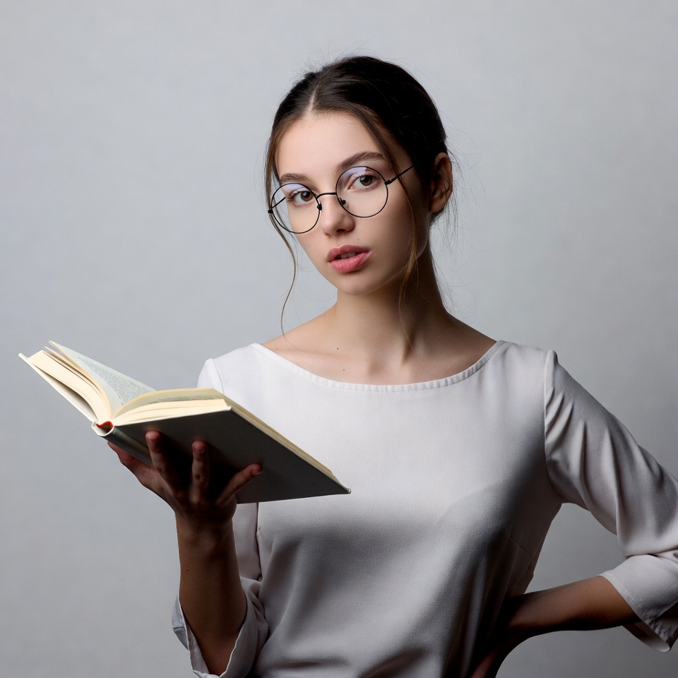 A young woman with dark hair tied in a bun wears round glasses and a white off-shoulder top. She holds an open book in her hands, looking directly at the camera against a plain gray background. Her expression is neutral with slightly parted lips.